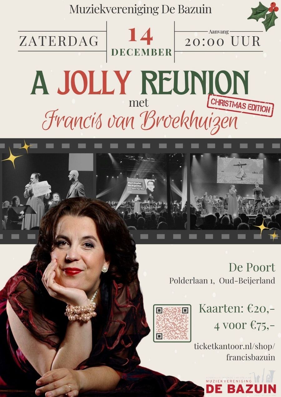 OUD-BEIJERLAND – Muziekvereniging De Bazuin geeft op zaterdag 14 december een kerstconcert in De Poort, Polderlaan 1 in Oud-Beijerland. Voor dit concert heeft de vereniging opnieuw sopraan Francis van Broekhuizen uitgenodigd. Zij zal met het harmonieorkest o.l.v. Arno Schipdam een divers programma ten gehore brengen.Na het succesvolle concert ‘Vivo’ in 2022 gaat het harmonieorkest van De Bazuin wederom een samenwerking aan met de operadiva. Tijdens ‘A Jolly Reunion’ viert de muziekvereniging haar 95-jarige jubileum met een weerzien met de veelzijdige zangeres en hangen zij gezamenlijk de ballen in de kerstboom om het publiek te laten genieten van een warm kerstconcert.