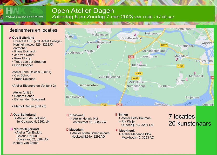 HOEKSCHE WAARD - Op 6 en 7 mei zijn de jaarlijkse Open Ateliers weer te bezoeken. Verschillende locaties in het fraaie landschap van de Hoeksche Waard zijn een ontmoetingsplaats met veelal lokale kunstenaars, professioneel of autodidact, en hun unieke en actuele kunst in al zijn vormen. Er zijn 20 deelnemers op 7 locaties te bezoeken verspreid door de Hoeksche Waard.